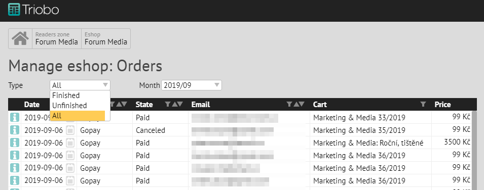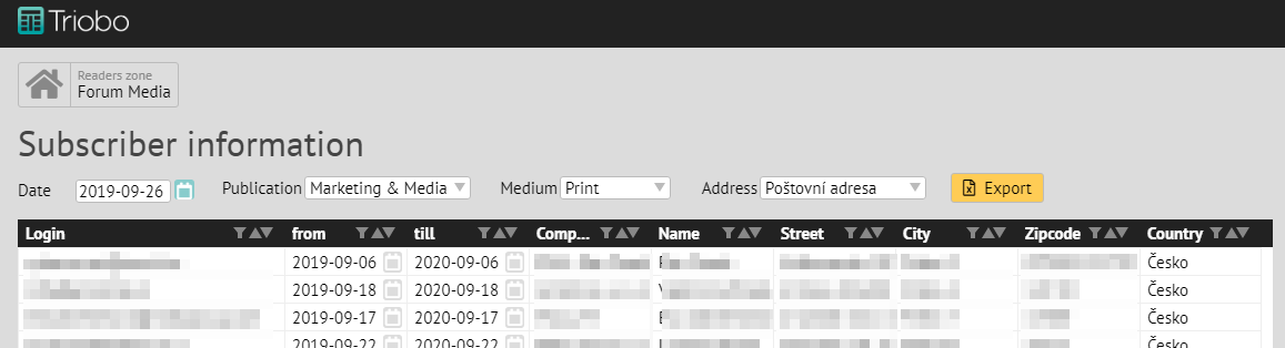 Primárně pro potřeby distribuce tištěných vydání jsme připravili seznam předplatitelů platný pro konkrétní den. Hodí se vydavatelům, kteří využívají Triobo e-shop pro prodej předplatných.