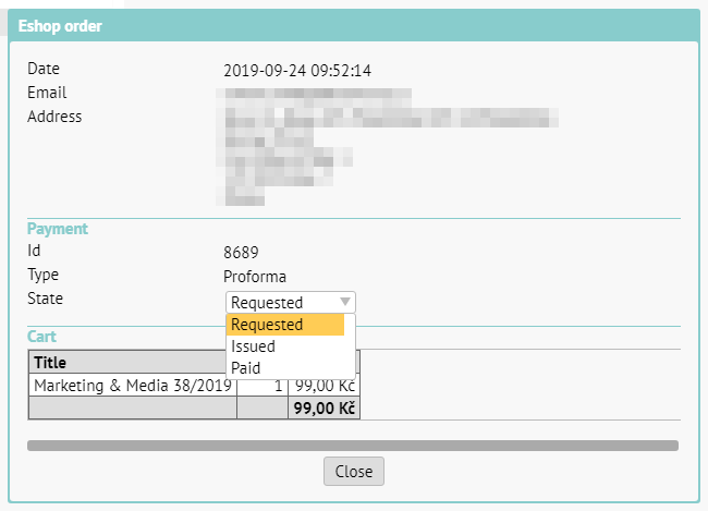 Chcete-li změnit stav konkrétní objednávky se zálohovou fakturou, klikněte na ikonu [i] na začátku řádku. Objeví se dialog s detaily: