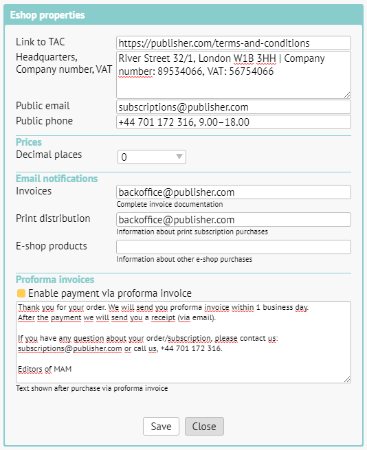 Emailové notifikace: neveřejné maily, na které se odesílají notifikace o přijatých objednávkách. Všimněte si, že můžete mít různé maily pro příjem notifikací s podklady pro fakturaci, pro distribuci tištěných předplatných a pro příbuzné produkty. Pokud neprodáváte v eshopu žádné příbuzné produkty, položku nevyplníte.