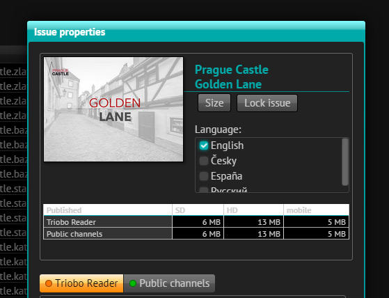 From the publisher perspective, the individual language versions are assigned to appropriate language in Triobo editor, under the Settings dialog of issue properties (if language version with switching is activated in your reader): ! Multilanguage setting and publications