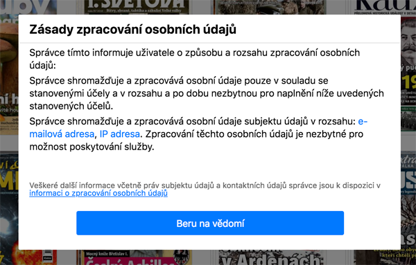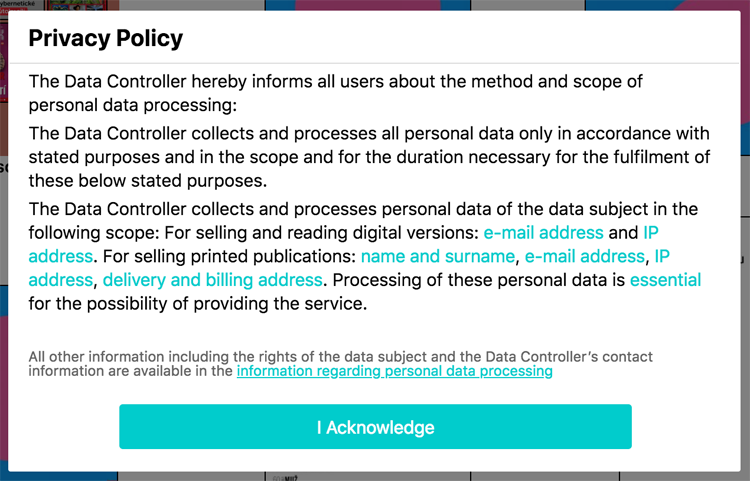This is how the dialog, that appears during registration of the reader or during his first login after launching GDPR support (or after any change of the text in the dialog). Readers that do not login are not bothered by this. The dialog contains shortened version of the information regarding personal data processing according to the GDPR principles: